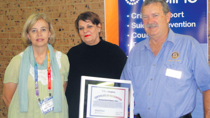 Mr Stewart Eldridge, member of the North Gosford Rotary club, was presented with a certificate of merit on behalf of the world-wide recognised leaders in suicide prevention, LivingWorks. He is one of many that make up the SOKS (Save Our Kids) committee, whose goal is to prevent youth suicide and enrich youth life on the Central Coast.